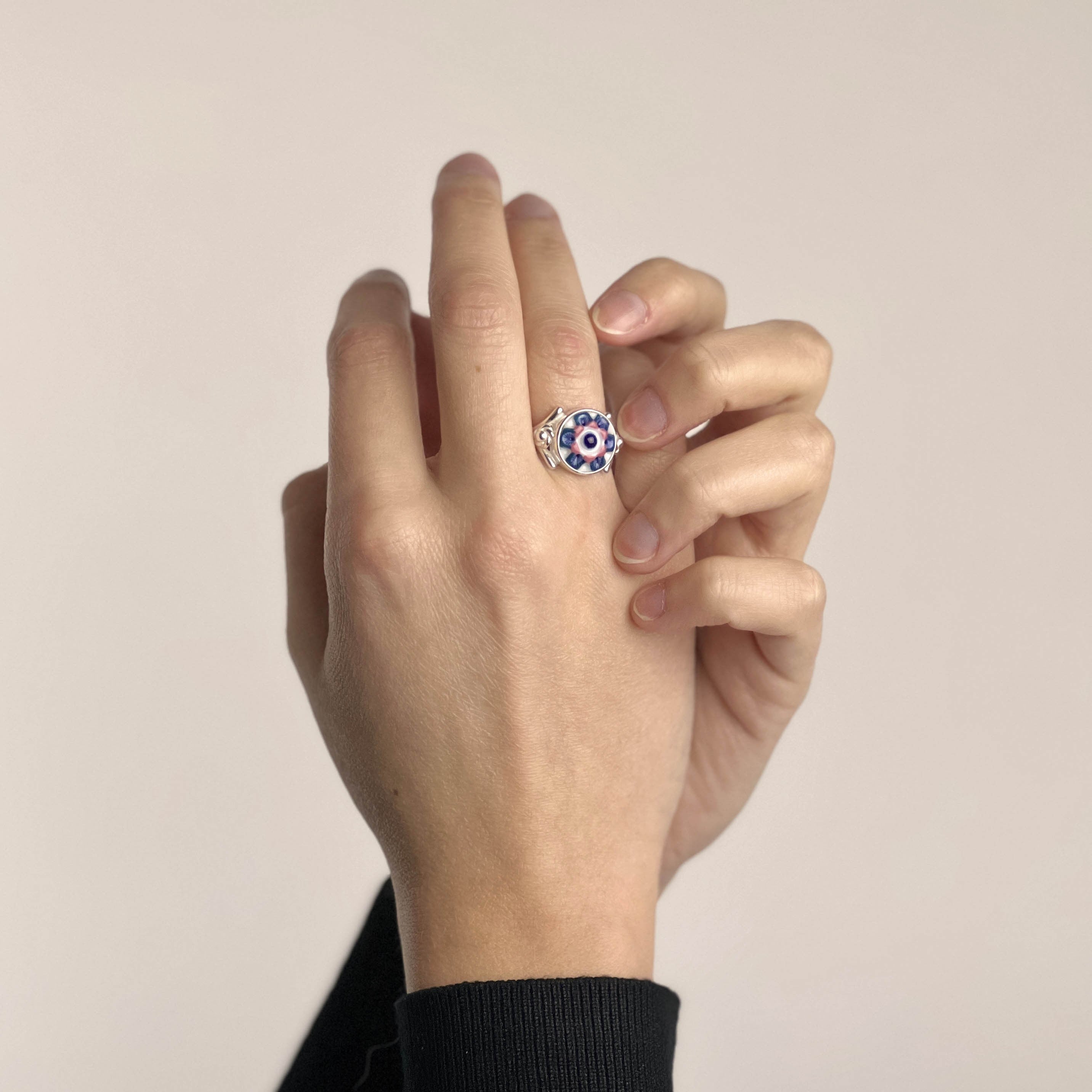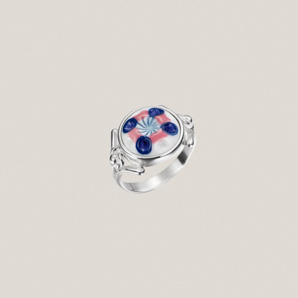 Anillo en plata de 1ª Ley con placa de porcelana tallada y pintada a mano bajo esmalte.