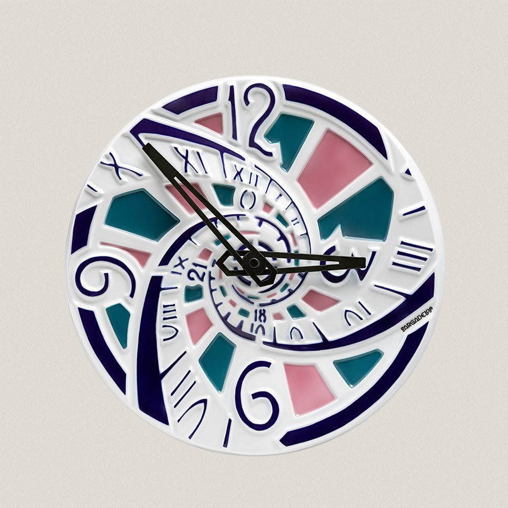 Este reloj no es un objeto con el único propósito de medir el tiempo, es una reflexión sobre el concepto mismo del tiempo. SARGADELOS se ha inspirado en la geometría de la triple escalera helicoidal del Convento de Santo Domingo de Bonaval (actual Museo del Pueblo Gallego) para alcanzar una interpretación del tiempo más acertada que la que ofrecen los relojes convencionales. Introducimos una combinación de materiales entre la cerámica y la madera de las agujas y la tapa trasera, que da acceso a un mecanismo de precisión silencioso. Medidas: Diámetro: 34 cm Altura: 4cm Material: Porcelana. Cuidados: Limpiar con un paño suave y húmedo.